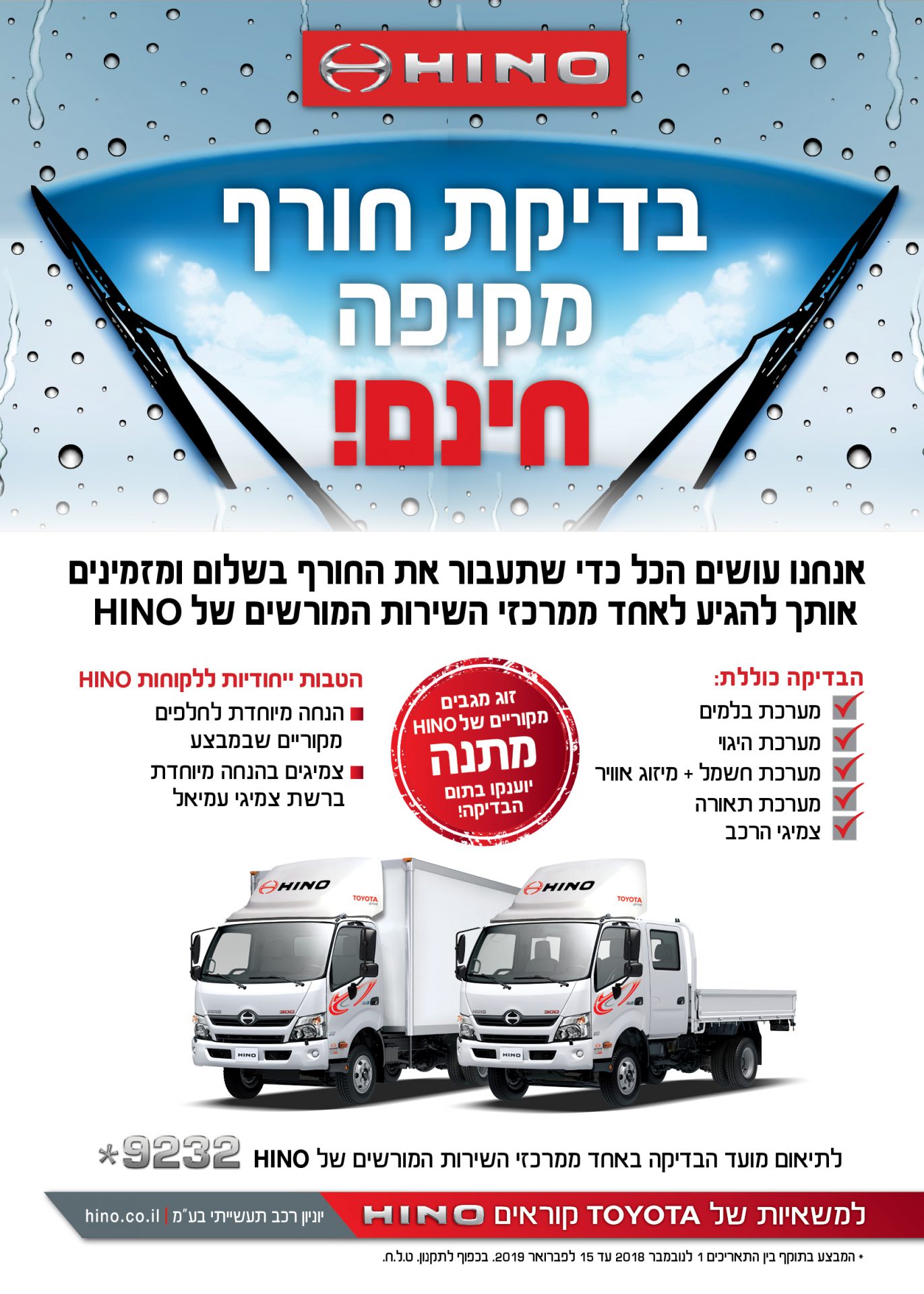 אנחנו עושים הכל כדי שתעבור את החורף בשלום ומזמינים אותך להגיע לאחד ממרכזי השירות המורשים של HINO לבדיקת חורף מקיפה חינם